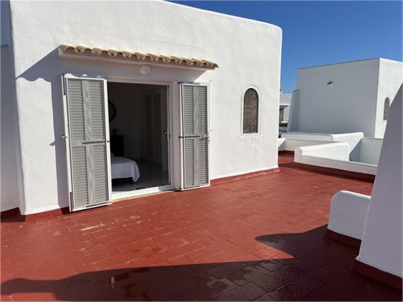På första våningen finns 1 sovrum , 1 badrum och en vacker stor terrass i söderläge med trappor till takterrassen som har fantastisk utsikt över havet.